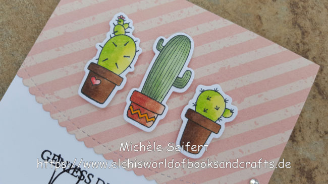 Huhu meine lieben Bastelfreunde, heute wird es stachelig… Dieses Mal habe ich mich für ein kleineres Format in 11 x 11 cm entschieden. Sonst sind meine Karten, wenn sie quadratisch sind, ja meist 14,5 x 14,5 cm groß. Aber heute war mir mal nach etwas Kleinerem zumute! Passt auch besser zu den Kakteen. Die süssen…