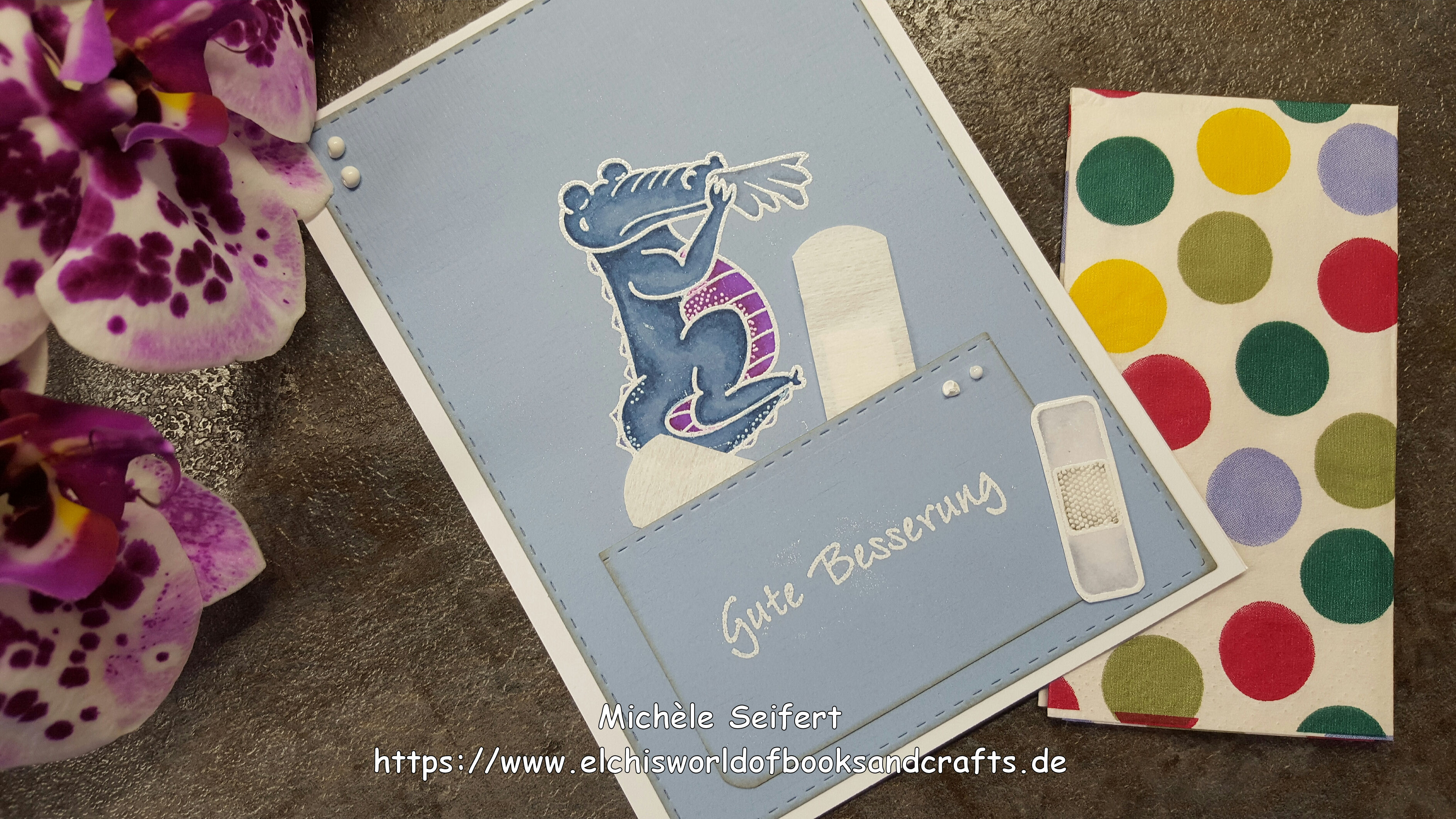 Hier mal ein Blick, wie die kleine Einstecktasche auf der Karte unterschiedlich befüllt ausschaut. Entweder ein paar Pflaster eingesteckt oder wie in meinem Fall ein buntes Punktetaschentuch hineingeschoben. Leider habe ich vergessen nochmal ein Bild zu machen, wo die beiden Pflaster gemeinsam mit dem Taschentuch in der Einstecktasche stecken, aber gut, man erkennt es auch so und kann die Karte schließlich befüllen, wie man mag.