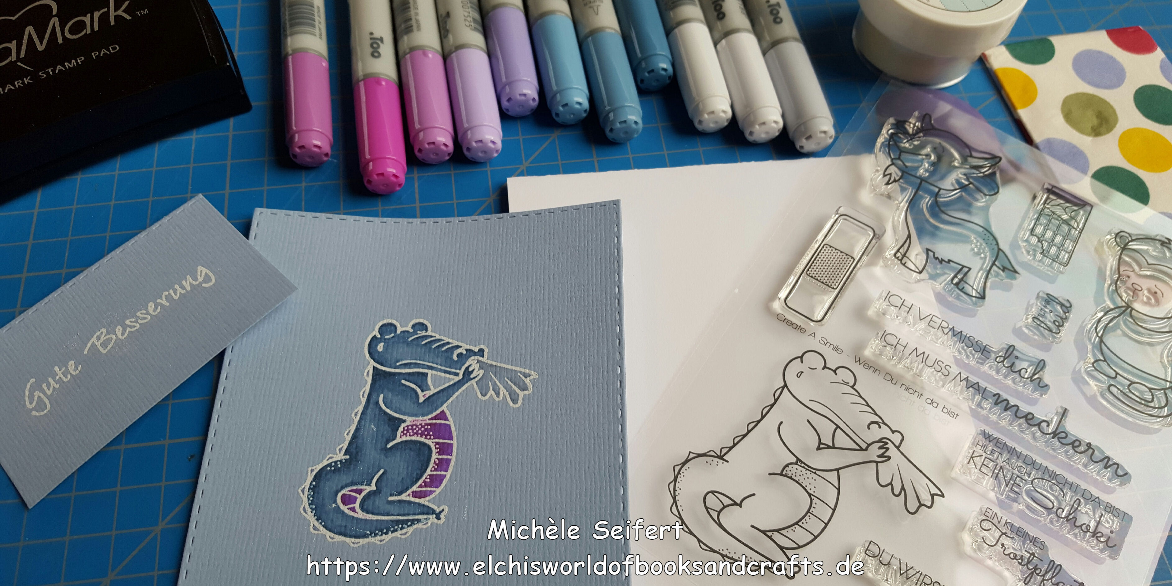 Krokodil, Pflaster und Text sind mit VersaMark gestempelt und weißem Embossingpulver von Stampin’Up embosst. Anschließend habe ich mit Copics coloriert.