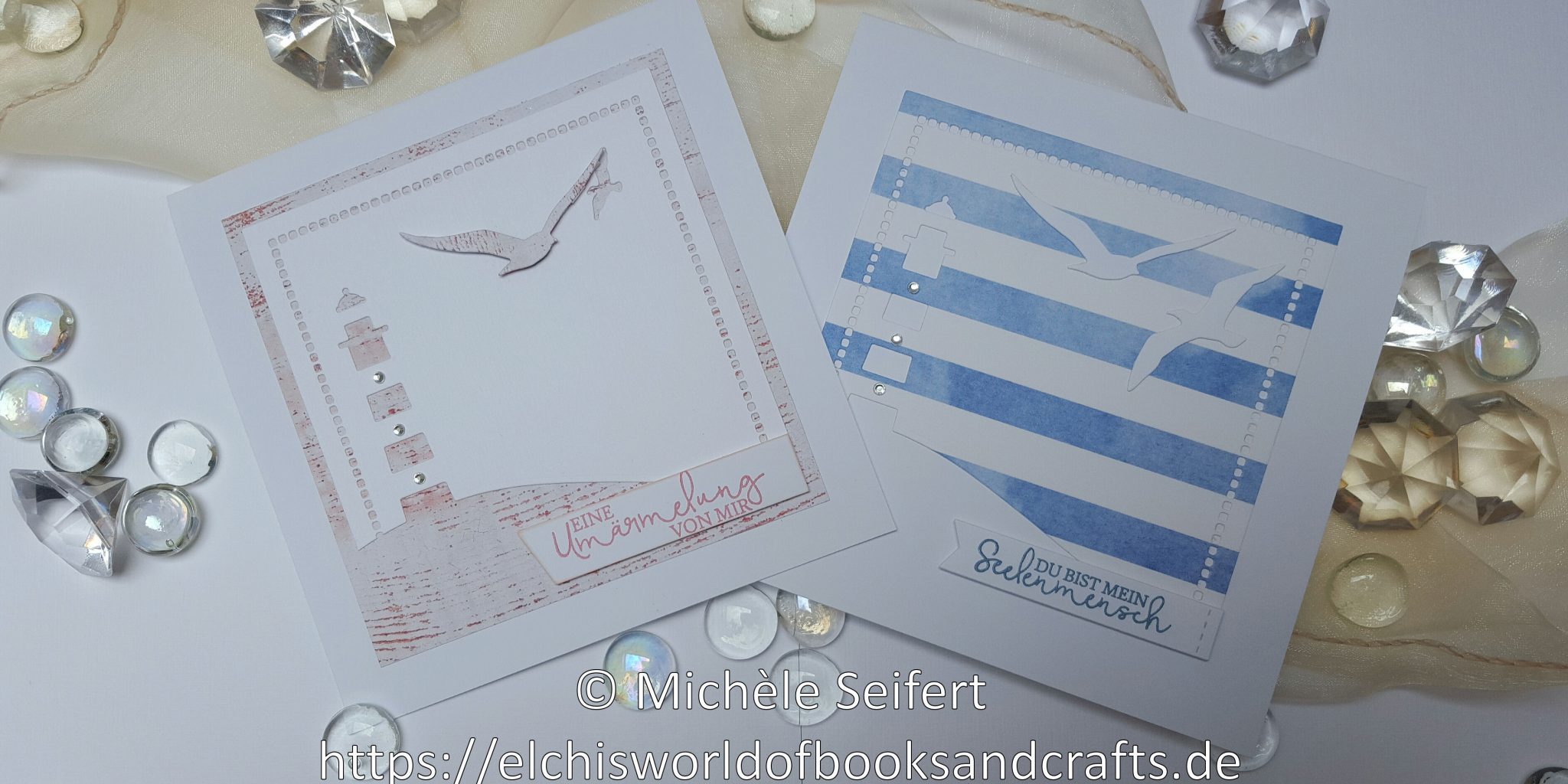 Bei Kärtchen Nummer zwei kommt wieder das tolle blau – weiße Aquarell-Streifen Design-Papier von Creative Depot zum Einsatz. Hier ist nur der Leuchtturm ausgestanzt und die beiden Möven sind aus weißem Cardstock und direkt auf die Karte geklebt.