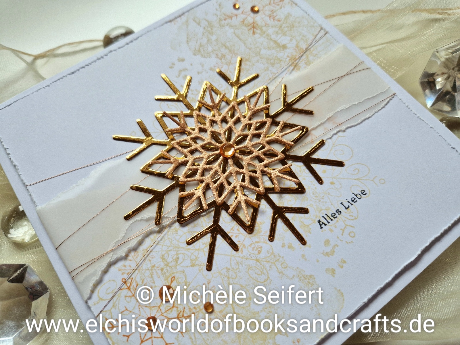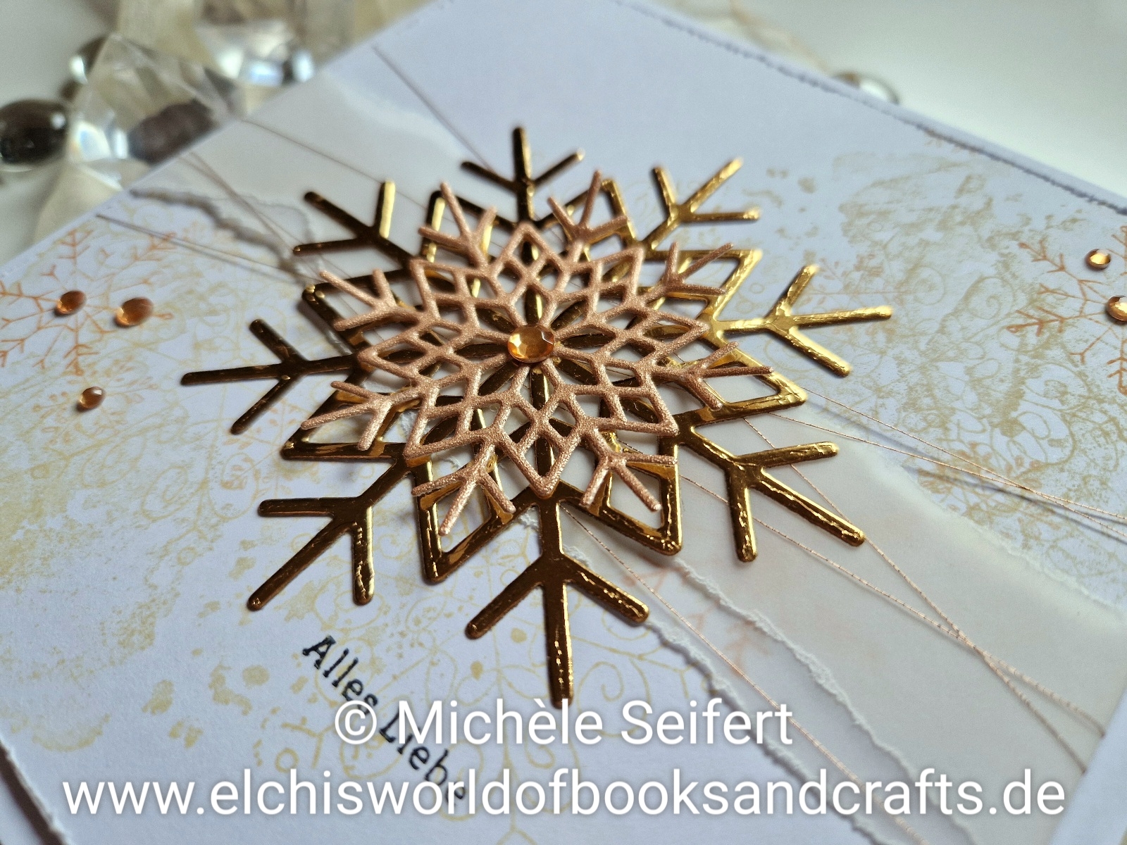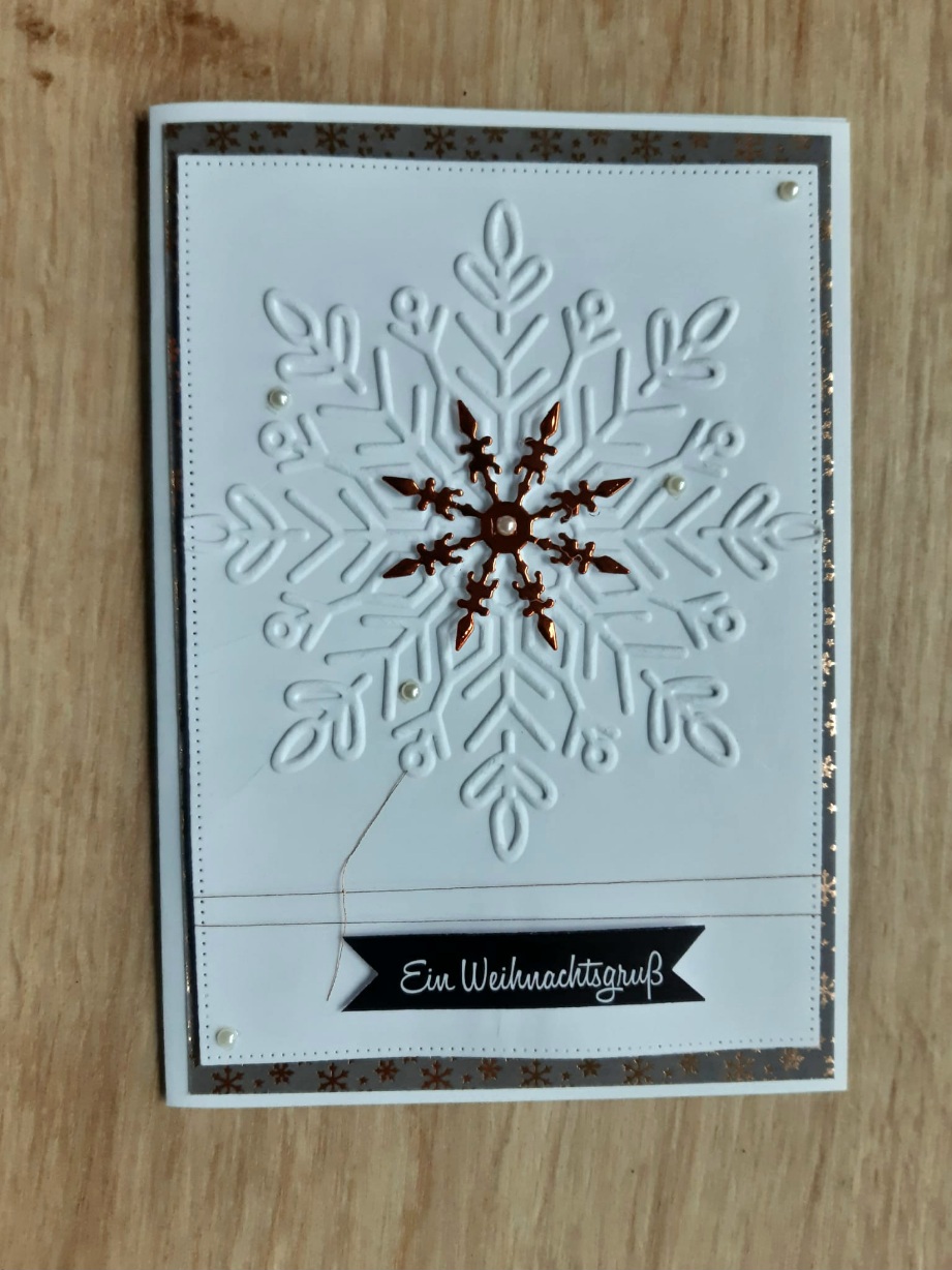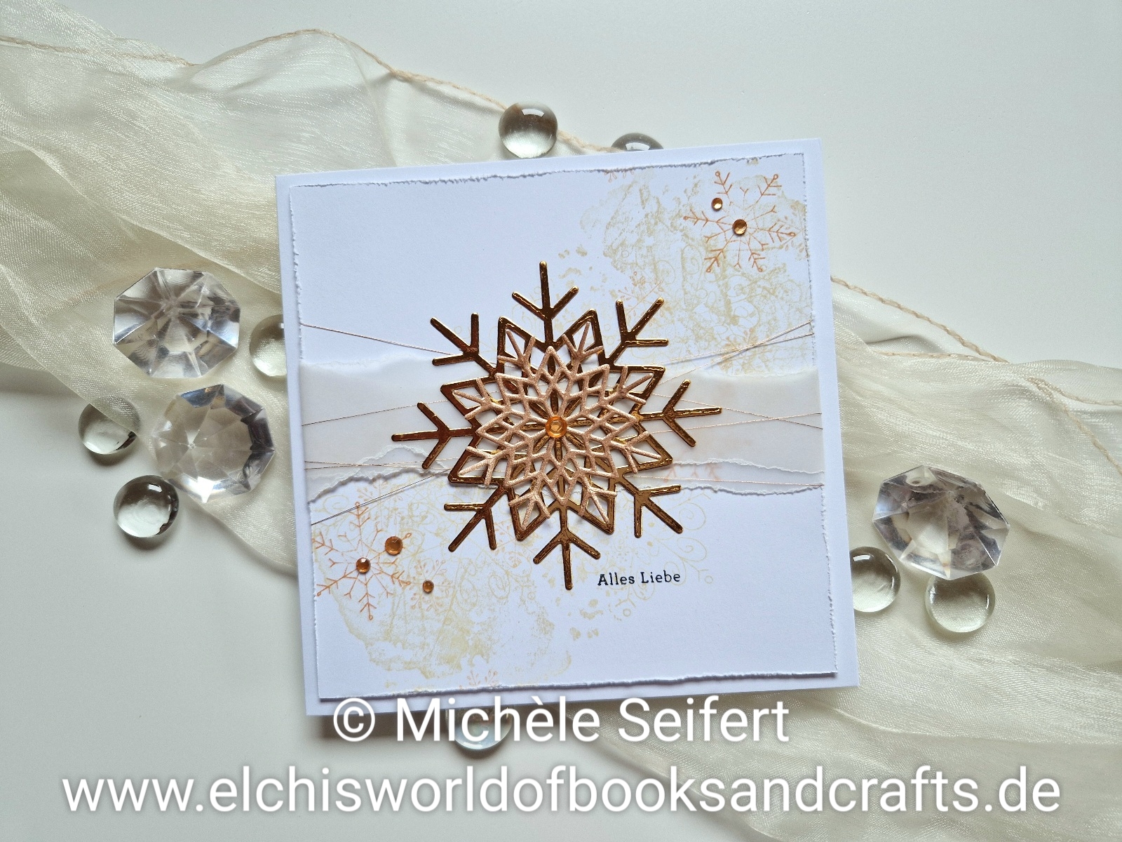 Meine Karte ist rund um eine große Schneeflocke aus kupferfarbenem Spiegelglanzkarton entstanden, diese ich zusätzlich mit einer etwas kleineren Schneeflocke aus kupferfarbenem Metallic-Cardstock gelayert habe.