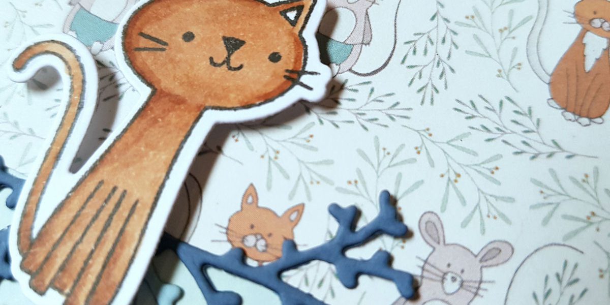In dem neuen Design-Papier Set „Happy Herbst“ von Faltkarten.com sind auch 2 Bögen mit diesem süssen Katz und Maus Print dabei, weshalb ich mich entschlossen habe dieses auf ein Kärtchen zu bringen. Passend dazu habe ich mir eine Mieze aus dem Stempelset „Cute Cats“ von My Favorite Things gewählt…