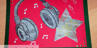 Die Farben habe ich dabei einfach in Rot, Grün und Grau gehalten. Da ich keine Kopfhörer-Stanze habe und auch keinen Stempel, habe ich mir ein Motiv ausgedruckt und ausgeschnitten… Den Stern habe ich mit Washi-Tape beklebt und schnell noch mit dem Pearl-Maker-Pen ein paar Akzente in zwei Ecken gesetzt, damit die Karte nicht überladen ist und wirklich einfach und simpel erscheint, aber ihren Nutzen erfüllen kann.