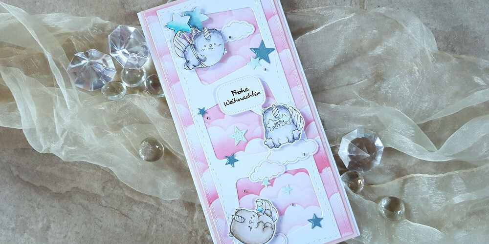Stempel: Paperie Ink – You Are | Karten-Kunst – Inchie-Grüße #4 | Stanzen: Simple and Basic – SBD122 – Base Slimcard | Whimsy Stamps – Slimline Marquee | Alexandra Renke – Kleine Sprechblasen rechts | Memory Box – Cosmic Star Set | Memory Box – Puffy Clouds | Stencil: My Favorite Things – Mini Cloud Edges