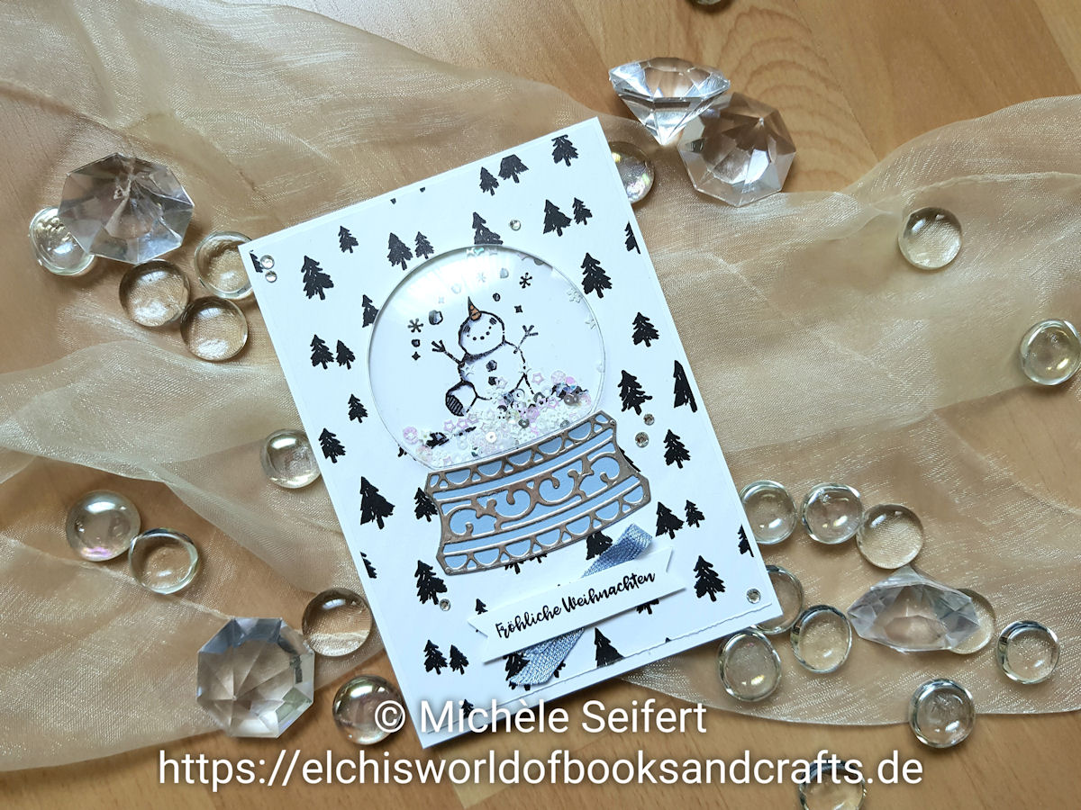 Für die Schüttelkarte habe ich die tolle Schneekugel Plastikkuppel verwendet, die wirklich eine kleine Wölbung hat. Gefüllt ist sie mit dem süssen Paillettenmix Schneeflöckchen und ein wenig Stampin‘ Glitter Eis.