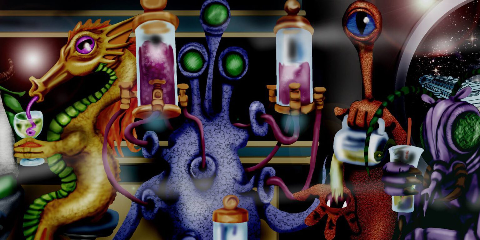 »Wenn dir mal wieder die unendlichen Weiten des Weltraumes zu viel werden und dich die Sorgen zu überwältigen drohen: Komm zu uns. Wir servieren dir mit einem Lächeln und einem offenen Ohr den Drink deiner Wahl.«